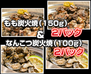 (1) コリコリが癖になるなんこつの炭焼き、大人気のもも炭焼きの2パックずつのセット
